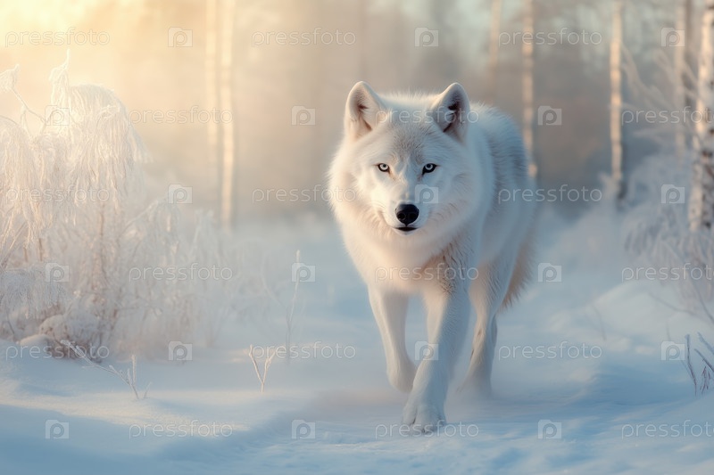 Красивый белый волк бежит по зимнему лесу на закате или рассвете