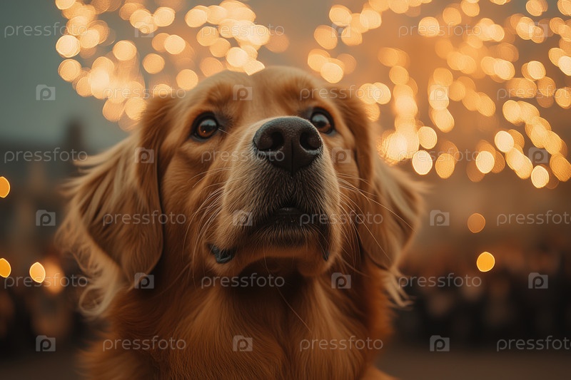 Собака породы золотистый ретривер на фоне фейерверков. Собаки боятся фейерверков