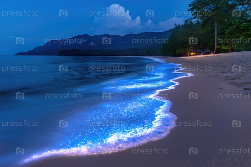 Светящийся прибой, вызванный биолюминесценцией морских организмов на тропическом пляже во время восхода солнца