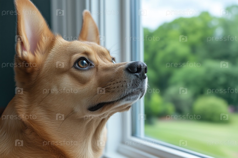 Милая собака смотрит в окно летним днем