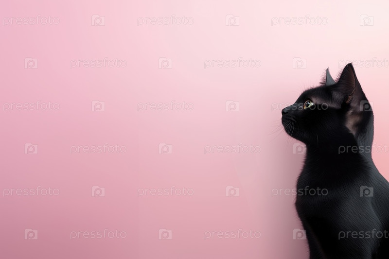 Черный кот на розовом фоне с копировальным пространством. Кот смотрит вверх