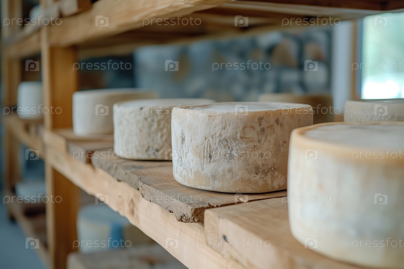 Сырные круги в погребе сыра на полке молочной фермы. Избирательный фокус