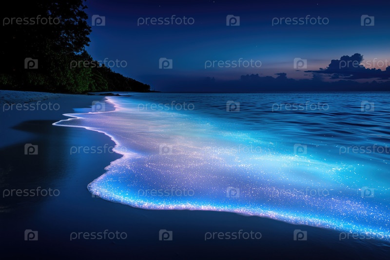 Светящиеся волны на тропическом пляже ночью, биолюминесценция
