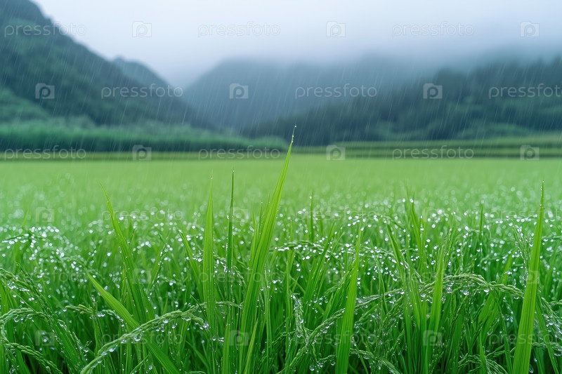 Дождь над рисовым полем в горной долине, капли дождя на листьях