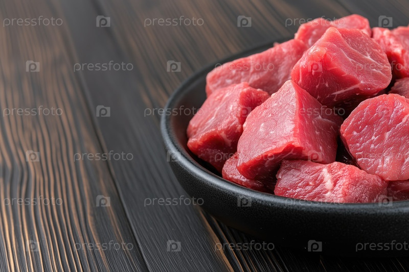 Кусочки сырого говяжьего мяса в черной миске на деревянном фоне