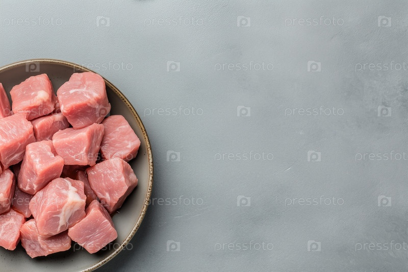 Сырые кубики свинины в миске на сером фоне. Вид сверху с копией пространства