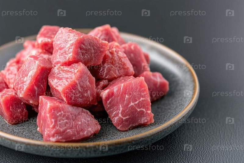 Сырые кубики говяжьего мяса на тарелке на черном фоне, крупный план