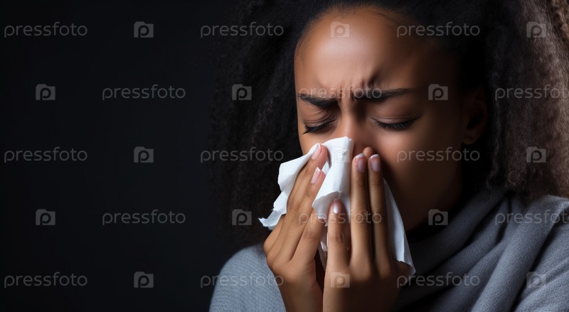 Темнокожая афроамериканка чихает, портрет крупным планом на сером фоне, место для текста, больной гриппом чихает, сморкается в платок, аллергия, простуда, симптомы вируса ковида