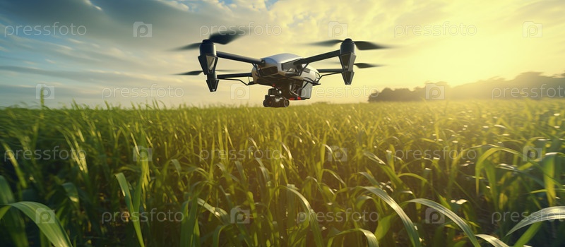 Беспилотный квадрокоптер на зеленом кукурузном поле