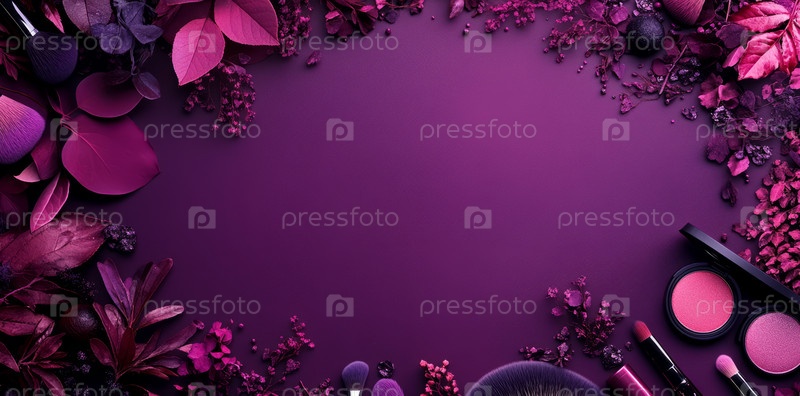На этом изображении запечатлена прекрасно скомпонованная коллекция элегантных косметических средств в фиолетовых тонах, отражающая креативность и стиль