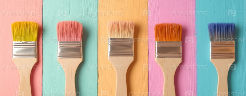 Красочная композиция из кистей на фоне расписных деревянных панелей