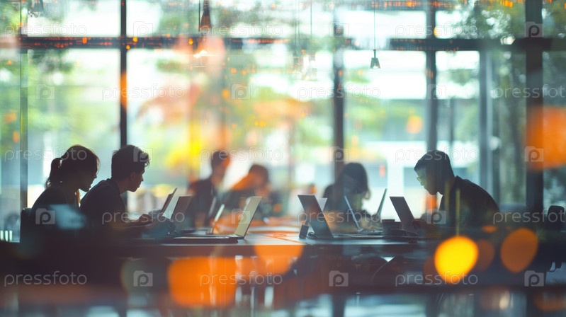 Уютное рабочее пространство с современным ноутбуком и работающими людьми