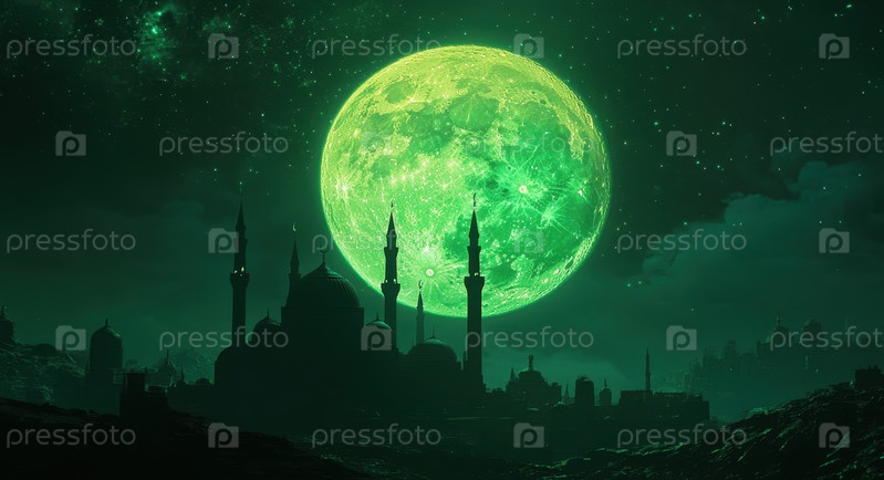 Очаровательная мечеть, залитая лунным светом, с величественным полумесяцем и звездным небом