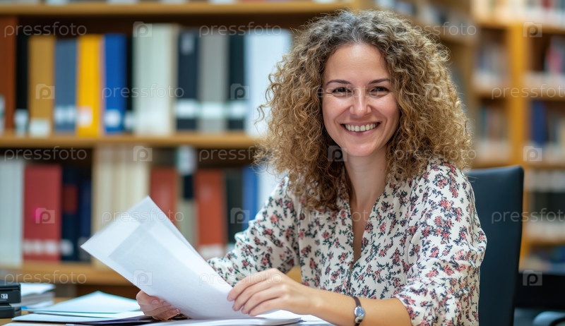 Женщина с вьющимися волосами, одетая в цветочную блузку, читает документы в библиотеке, создавая атмосферу учебы и сосредоточенности