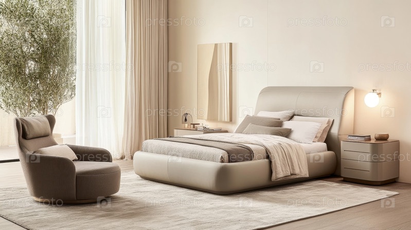 Роскошный современный интерьер спальни с элегантными элементами дизайна