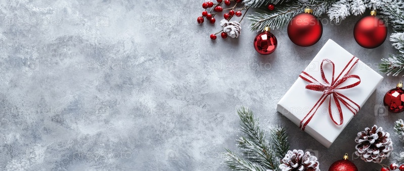Красиво упакованный праздничный подарок, расположенный среди сосновых веток и украшений, воплощает дух Рождества с элегантностью и очарованием