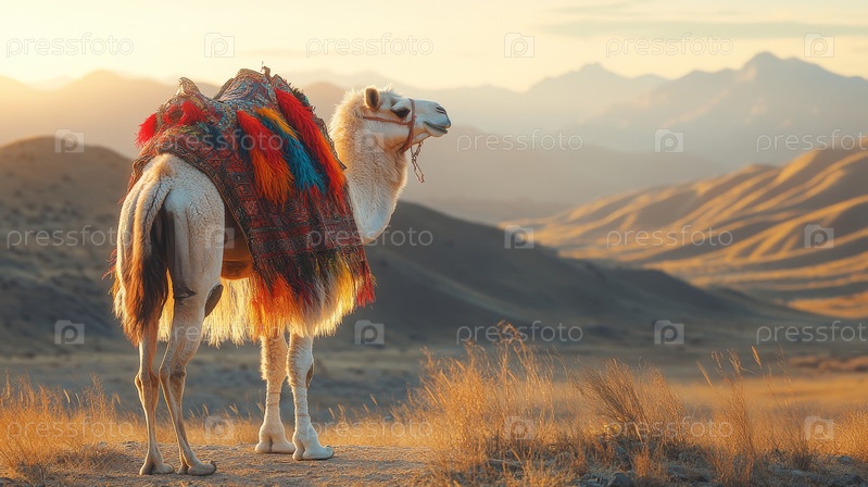 Потрясающее изображение верблюда, украшенного красочными традиционными украшениями, величественно возвышающегося на фоне обширной и безмятежной монгольской степи, демонстрирующее культурную красоту и природное великолепие