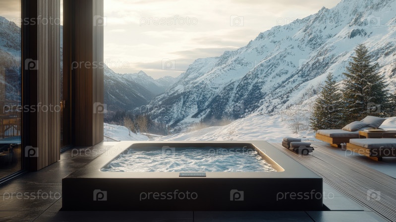 Почувствуйте полное расслабление в этой горячей ванне с паром, окруженной потрясающими заснеженными горами, которая идеально подходит для отдыха после дня, проведенного на склонах