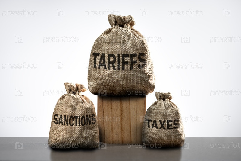 Новая большая торговая война. Концепция новых больших торговых тарифов, налогов, санкций. Сумки с тарифами, санкциями и торговыми налогами на сером фоне