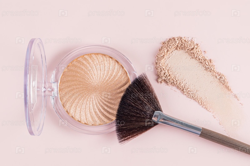Шикарная открытая упаковка хайлайтера с блестками натурального тона, штрих, образец текстуры и веерная кисточка для макияжа на пастельном фоне. Вид сверху. Крупный план