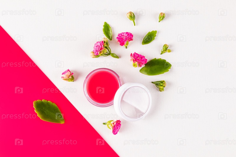 Шикарный косметический продукт, бальзам, масло, блеск для губ в круглой косметической баночке на декоративном подносе среди розовых цветов и абстрактного фона. вид сверху