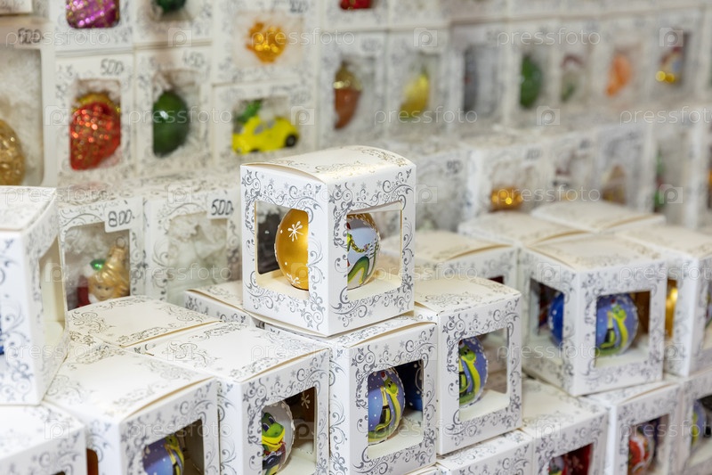 Россия. Санкт-Петербург. Продажа елковых украшений на новогоднем ярмарке. Россия. Санкт-Петербург. Продажа рождественских декораций на Новогодней ярмарке