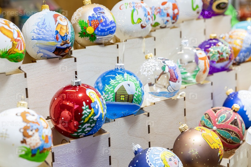 Россия. Санкт-Петербург. Продажа елковых украшений на новогоднем ярмарке. Россия. Санкт-Петербург. Продажа рождественских декораций на Новогодней ярмарке