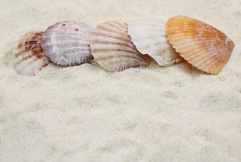 Коллекция разноцветных ракушек на мягком песке, изображающая красоту побережья