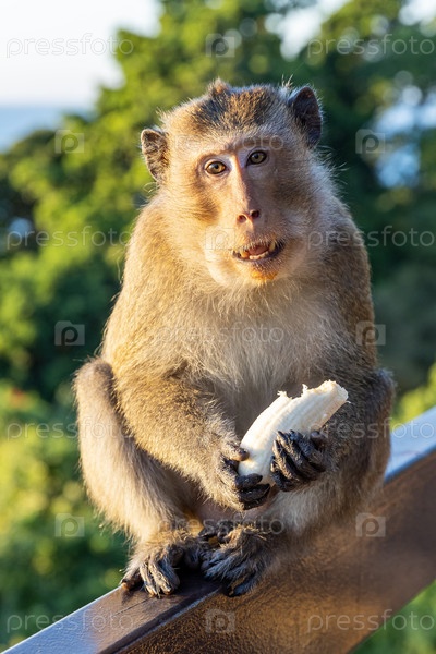 Таиланд. Ко Чанг. Обезьяна макаковой породы ест банан. Таиланд. Koh Chang. A macaque monkey eats a banana