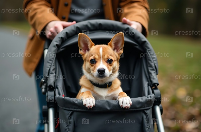 Женщина везет питомца в коляске, собака гуляет снаружи, сидя в саду. Генеративный искусственный интеллект