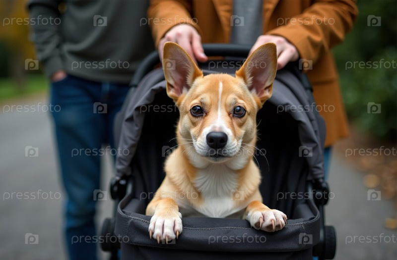 Женщина везет питомца в коляске, собака гуляет снаружи, сидя в саду. Генеративный искусственный интеллект