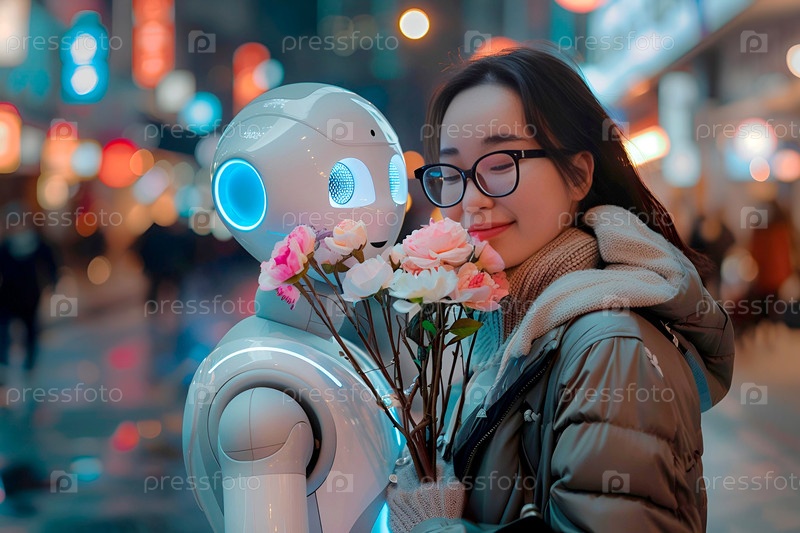 Робот на улице дарит цветы молодой азиатке. Будущее коммуникаций