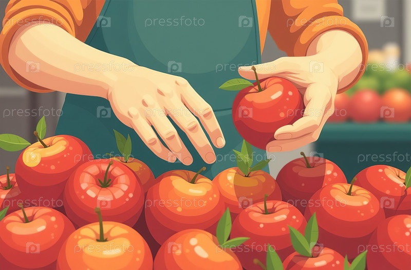 Женщина покупает яблоки на рынке, крупный план рук, витрина с фруктами. Генеративный искусственный интеллект