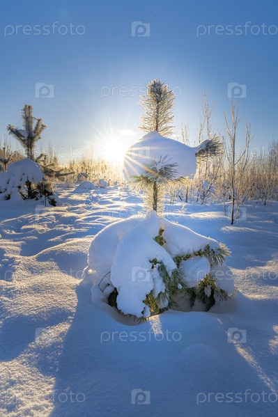 утро рассвет елка снег иголки лес поле зима сугроб ствол