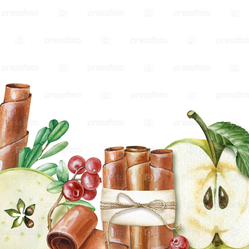 Акварельная квадратная рамка с зелеными яблоками, яблочной пастой, веточками клюквы и зелеными листьями. Связка зефира, связанная шнуром, и отдельные рулетики зефира. Ботаническая иллюстрация нарисована отдельно на белом фоне. Подходит для любого дизайна