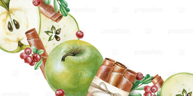 Акварельная прямоугольная рамка с диагональным рисунком из зеленых яблок, яблочной пасты, веточек клюквы и зеленых листьев. Связка зефира, связанная веревкой, и отдельные зефирные трубочки. Ботаническая иллюстрация нарисована отдельно на белом фоне. Подхо