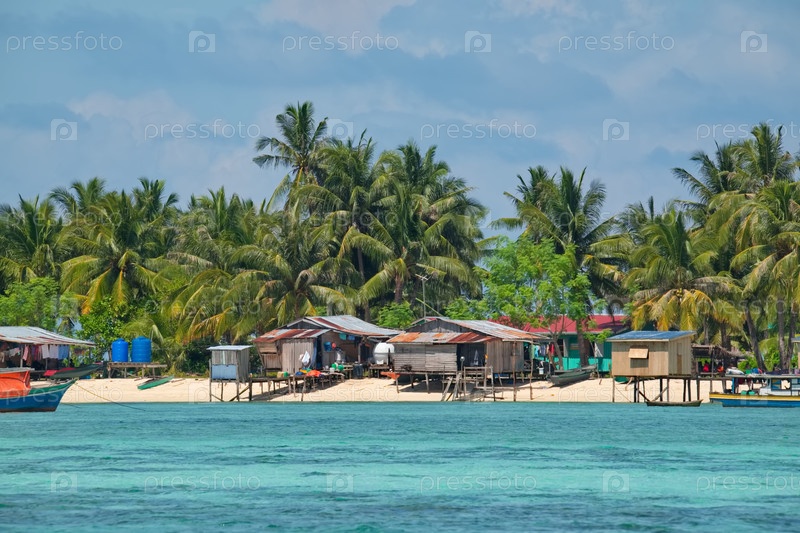 Восточная Малайзия. остров Борнео. 29 ноября 2018 г. Деревня морских цыган на песчаном острове с коралловым рифом. Основным занятием местных жителей является рыбалка и морские сувениры