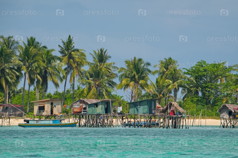 Восточная Малайзия. остров Борнео. 29 ноября 2018 г. Деревня морских цыган на песчаном острове с коралловым рифом. Основным занятием местных жителей является рыбалка и морские сувениры