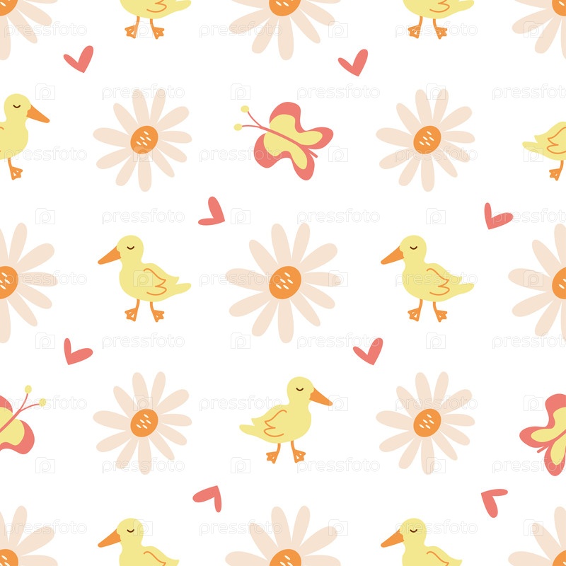 Бесшовный векторный узор с милыми нарисованными от руки детскими иллюстрациями, утятами, цветами и бабочками