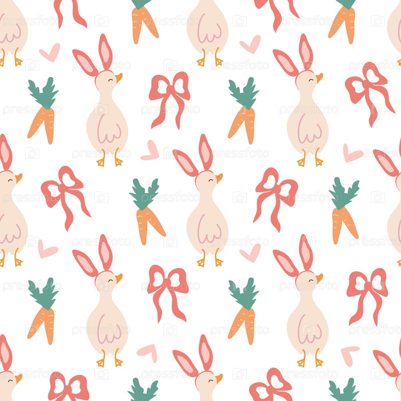 Пасхальный узор с утками, кроличьими ушками, бантами и морковками, праздничный бесшовный орнамент в векторе