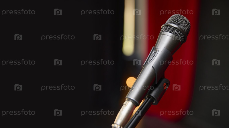 Микрофон установлен на стойке перед ярко-красным занавесом. Баннер для текста