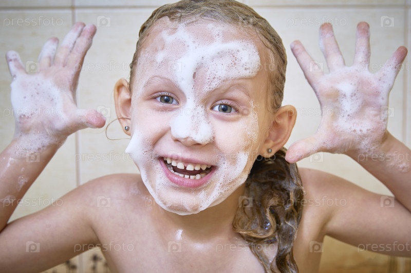 Маленькая девочка с пеной на голове в ванной. Ребенок моется