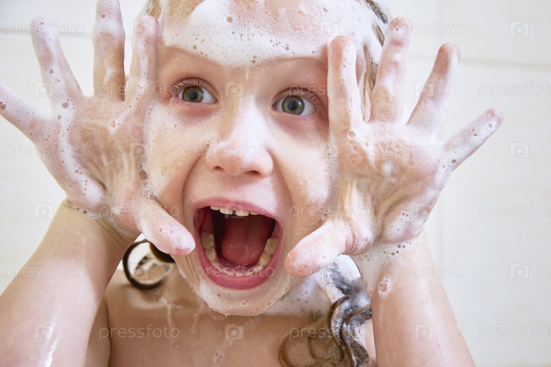 Ребенок в ванной, веселится и кричит. Крупный план