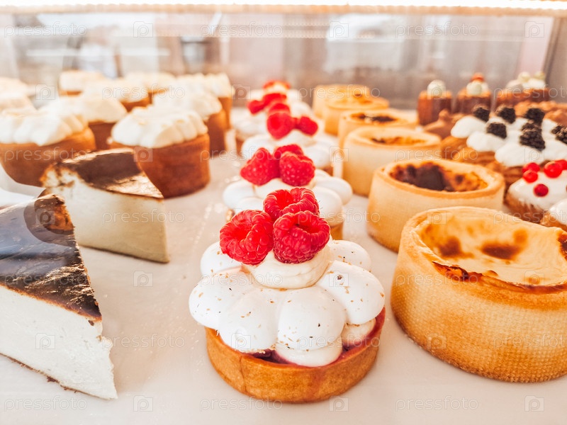 Крупный план свежеиспеченных десертов на витрине. Красочная французская выпечка