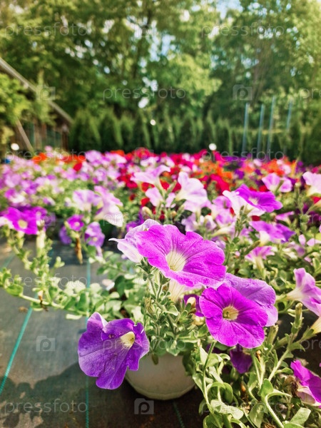 Красочные петунии в питомнике. Крупный план цветов петунии, растущих в зеленом саду