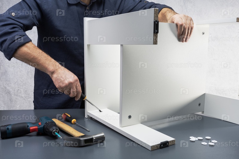 Мастер собирает мебель. Мужчина использует отвертку для сборки полки