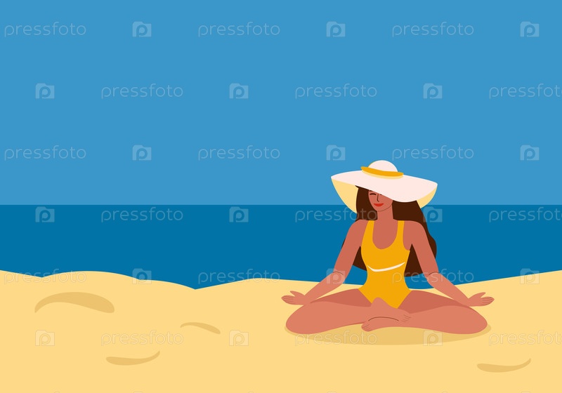 Молодая загорелая женщина медитирует на пляже