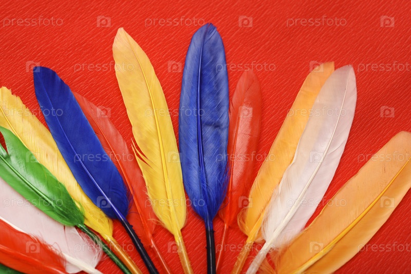 Разноцветные перья на красном фоне. Декоративные перья