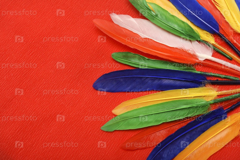 Разноцветные перья на красном фоне. Декоративные перья