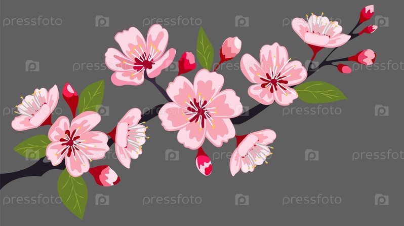 Потрясающая векторная иллюстрация цветущей сакуры, демонстрирующая нежные розовые цветы и яркие зеленые листья на приглушенном фоне